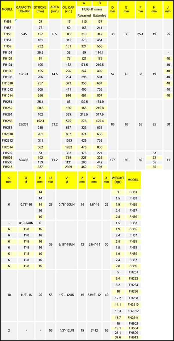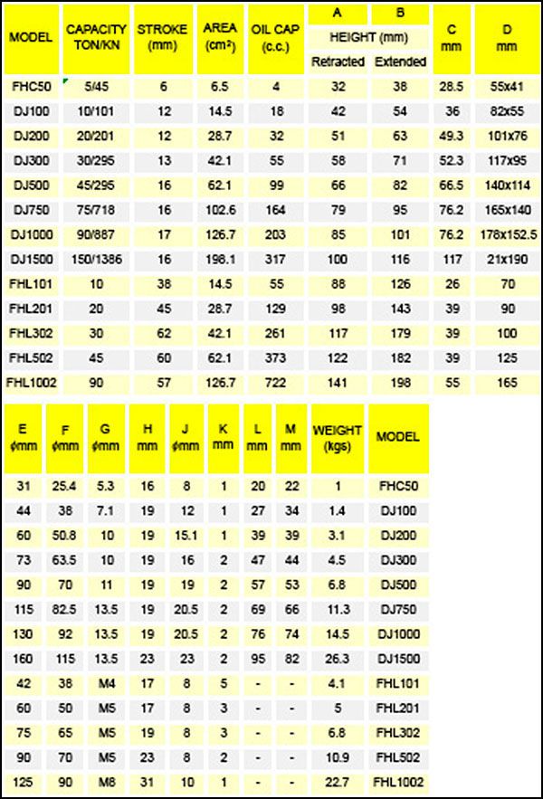 - Solid plunger-design hydraulic cylinders in 5,10, 25 and 50 tonne ratings.